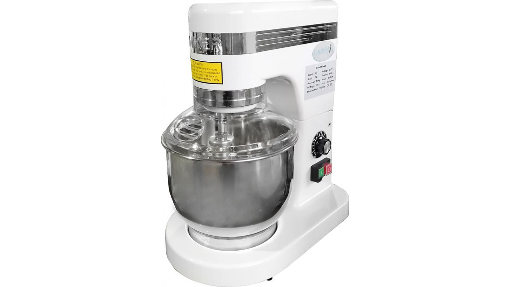230 × 350 × 400 мм; 220 В; 0,3 кВт; 14 кг; настольный; съёмная дежа ёмкостью 5 л; откидная рабочая голова; плавная регулировки скорости до 1020 об/мин; электромеханическое управление; три насадки в комплекте; корпус выполнен из алюминия, съемная дежа - из нержавеющей стали, защитная крышка - из прочного пластика.