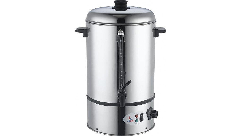 350 × 350 × 570 мм; 220 В; 1,6 кВт; 3,68 кг; в комплекте трубка для кипятка и фильтр для кофе; полезный объём: 15 л; накопительный; ручной залив воды; индикатор уровня и температуры воды; без режима поддержания тепла; температурный режим: 30…95 °С; электромеханическое управление; корпус из нержавеющей стали; не предназначен для заваривания чая.