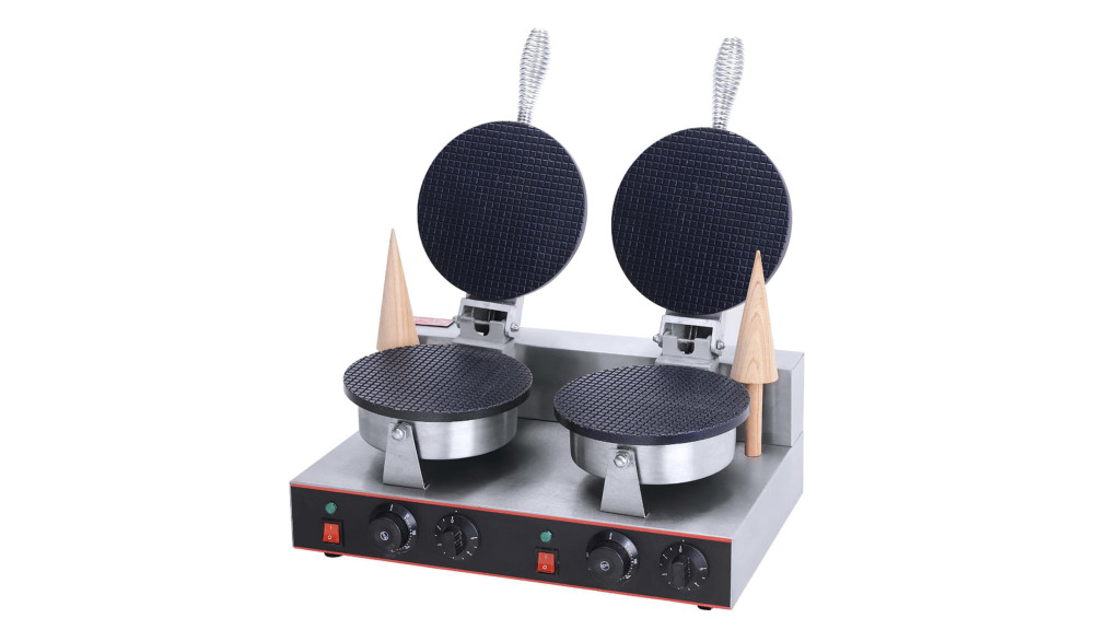 500 × 350 × 250 мм; 2 кВт; 220 В; 10,4 кг; материал поверхности: чугун с антипригарным покрытием; форма вафель: круг; для изготовления из них рожков.