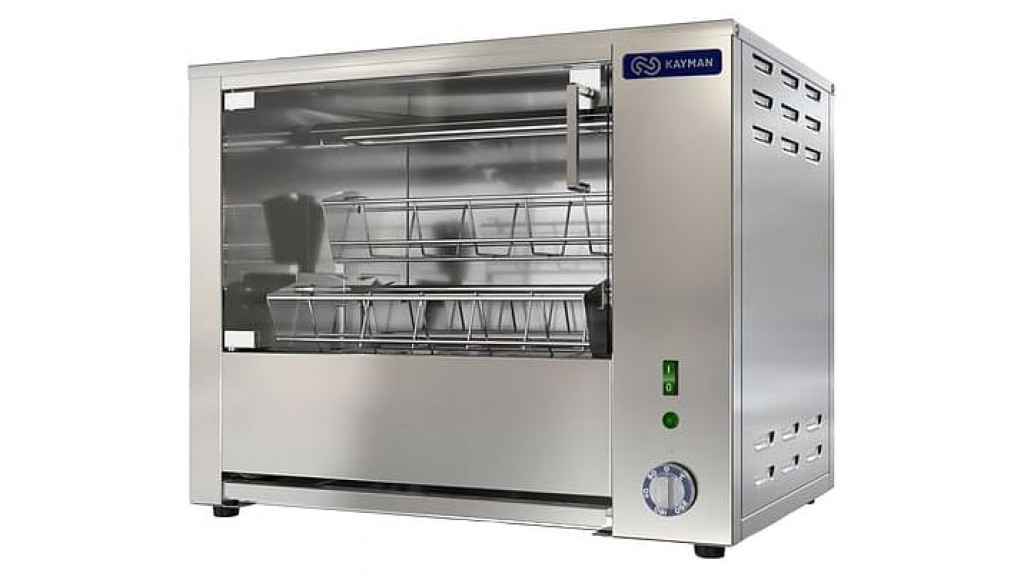 Гриль для кур Kayman ГЭ-4C8 A предназначен для одновременной жарки большого количества целых тушек, окорочков и других продуктов. Модель оснащена 4 легкосъемными садками (люльками), вращающимися вокруг центральной оси внутри рабочей камеры и ТЭНами. Корпус выполнен из пищевой нержавеющей стали AISI 430, садки для кур - из нержавеющего прутка, двери - из закаленного термостойкого ударопрочного стекла.