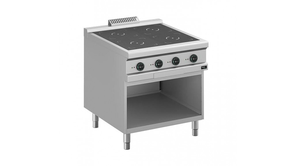 900 × 800 × 850 мм; 20 кВт; 380 В; 89 кг; 4 зоны нагрева; на полузакрытой подставке; электромеханическая панель управления; 6 температурных режимов; температурный режим: 60…240 °С; корпус из нержавеющей стали.