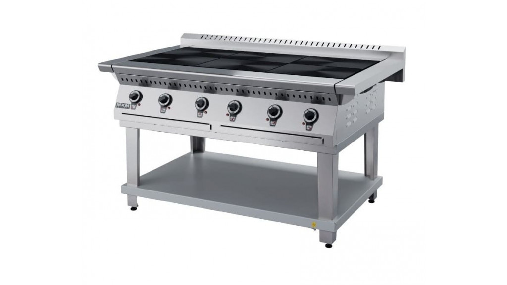 1265 × 850 × 860 мм; 380 В; 18 кВт; 120 кг; напольная с полкой; 6 конфорок размером 295 × 417 мм каждая; защита от перегрева; электромеханическая панель управления; корпус выполнен из нержавеющей стали, конфорки - из чугуна.
