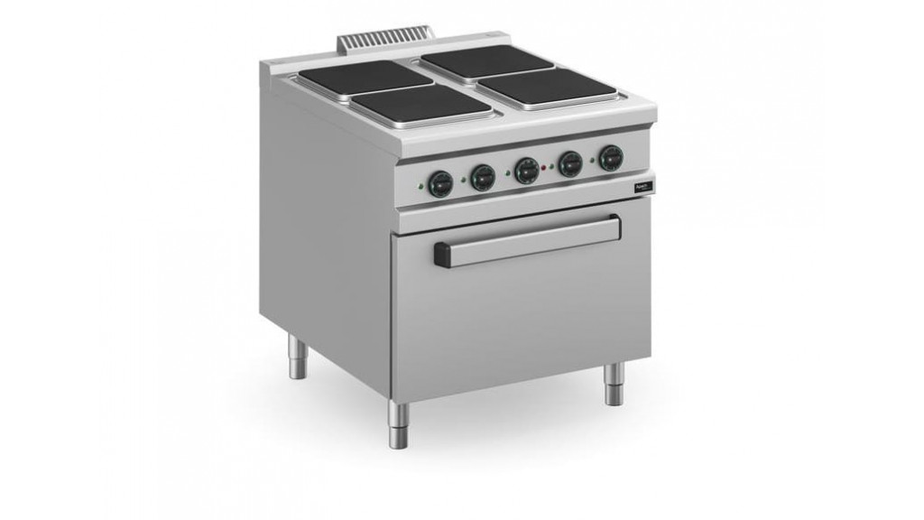 800× 900 × 850 мм; 380 В; 19 кВт; 128 кг; напольная с конвекционным жарочным шкафом; 4 конфорки размером 300 × 300 мм каждая; защита от перегрева; 6 температурных режимов; электромеханическая панель управления; корпус выполнен из нержавеющей стали; в комплект поставки входит решетка GN 2/1.