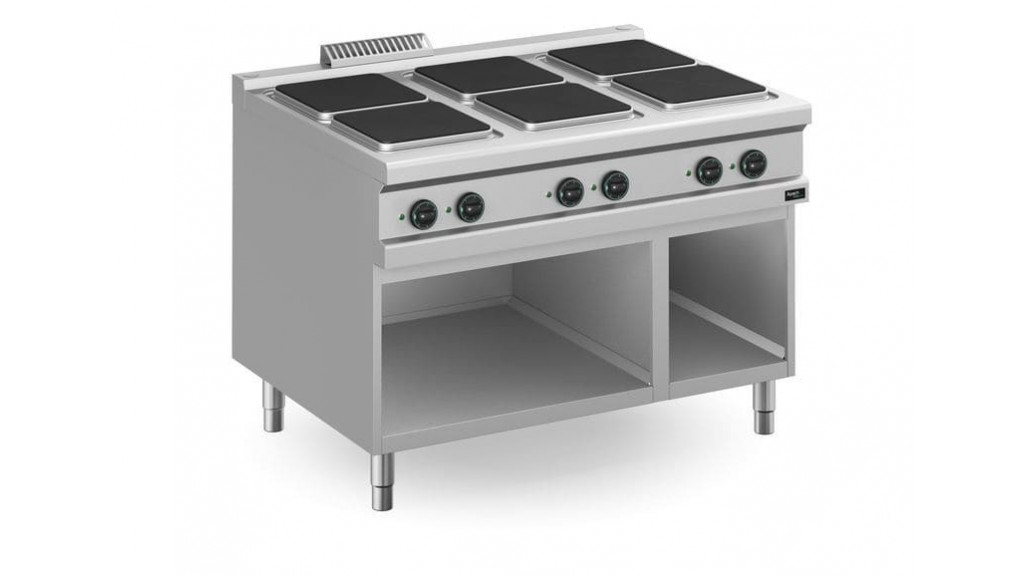 1200× 900 × 850 мм; 380 В; 20 кВт; 102 кг; напольная с открытой подставкой; 6 конфорок размером 300 × 300 мм каждая; защита от перегрева; 6 температурных режимов; электромеханическая панель управления; корпус выполнен из нержавеющей стали.
