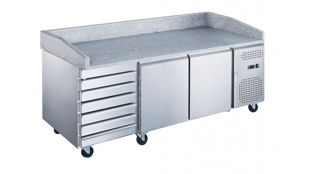 Гранитная столешница; с бортом; боковое расположение агрегата; шесть выдвижных ящиков; температурный режим: -2...+8 C°; 220 В; объём: 580 л; 0,32 кВт; 2020 × 850 × 1050 мм; 336 кг.