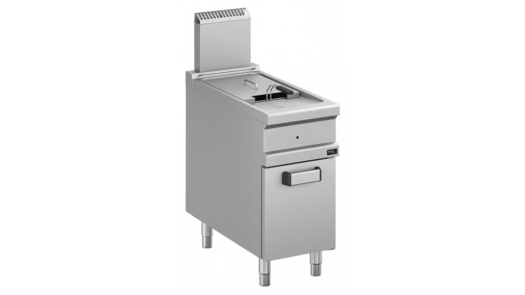 400× 900 × 1180 мм; 18 кВт; 64 кг; газовая; напольная; на закрытой подставке; горелка с пьезоэлектрическим поджигом и стабилизатором пламени; одна ванна объёмом 18 л; электромеханическое управление; холодная зона; температурный режим: 90…190 °С; в комплект входят форсунки для подключения к газовому баллону; корпус из нержавеющей стали.