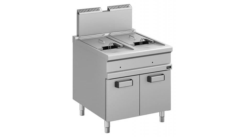 800× 900 × 850 мм; 36 кВт; 105 кг; газовая; напольная; на закрытой подставке; горелки с пьезоэлектрическим поджигом и стабилизатором пламени; две ванны объёмом 18 л каждая; кран для слива масла; электромеханическое управление; холодная зона; температурный режим: 90…190 °С; в комплект входят корзины с крышками и форсунки для подключения к газовому баллону; корпус из нержавеющей стали.