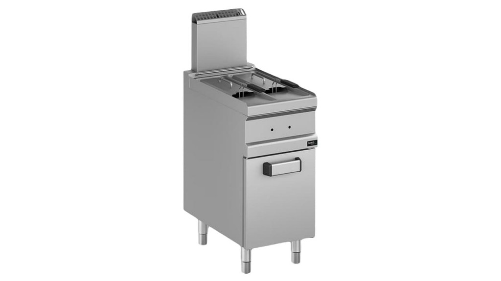 400× 700 × 1180 мм; 12,5 кВт; 51 кг; газовая; напольная; на закрытой подставке; горелка с пьезоэлектрическим поджигом и стабилизатором пламени; две ванны объёмом 7 л каждая; кран для слива масла; электромеханическое управление; холодная зона; температурный режим: 90…190 °С; в комплект входят корзины с крышками и форсунки для подключения к газовому баллону; корпус из нержавеющей стали.
