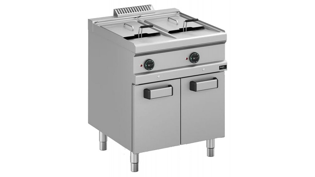 700× 700 × 850 мм; 380 В; 18 кВт; 63 кг; напольная; на закрытой подставке; две ванны объёмом 13 л каждая; электромеханическое управление; холодная зона; температурный режим: 90…190 °С; кран для слива; в комплект входят корзины с крышками; корпус из нержавеющей стали.