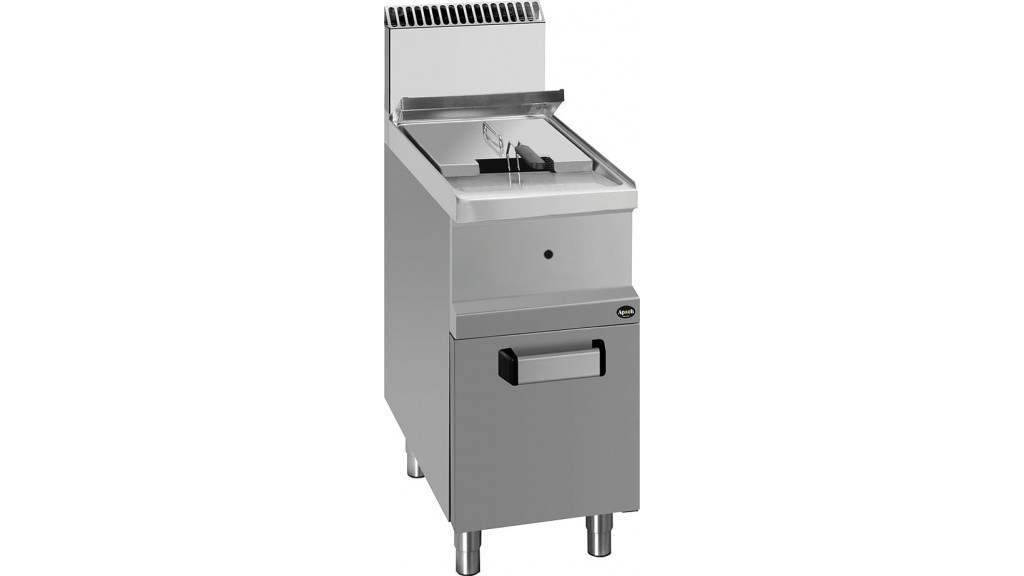 400× 700 × 1180 мм; 12,5 кВт; 26 кг; газовая; напольная; на закрытой подставке; горелка с пьезоэлектрическим поджигом и стабилизатором пламени; одна ванна объёмом 14 л; электромеханическое управление; холодная зона; температурный режим: 90…190 °С; в комплект входит корзина с крышкой и форсунки для подключения к газовому баллону; корпус из нержавеющей стали.