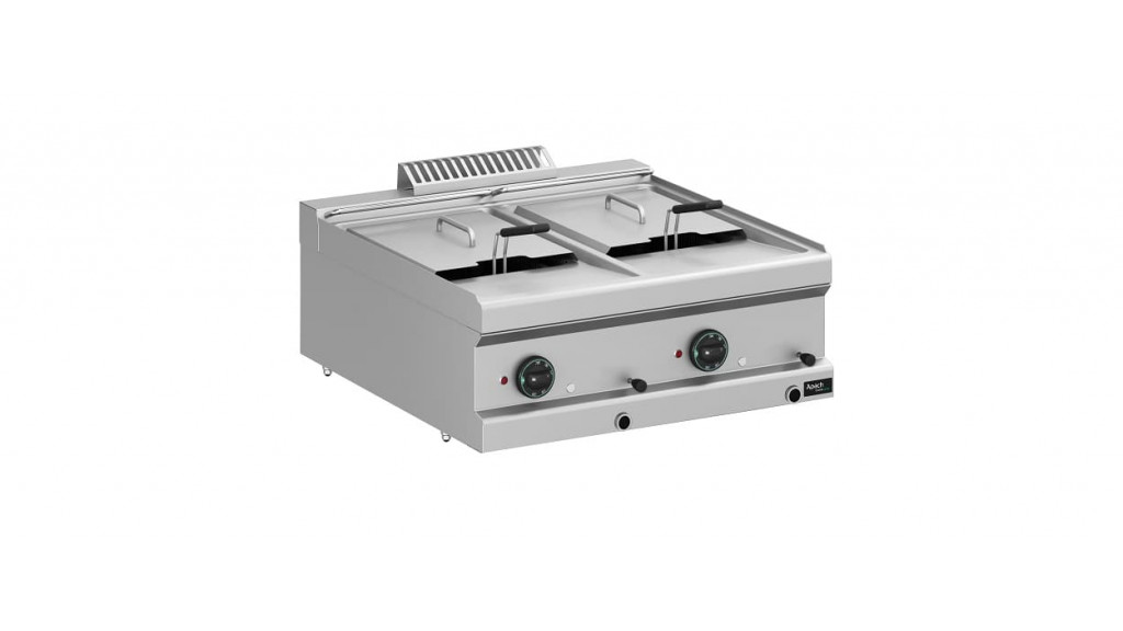 700× 700 × 580 мм; 14,8 кВт; 45 кг; газовая; напольная; горелка с пьезоэлектрическим поджигом и стабилизатором пламени; две ванны объёмом 9 л каждая; электромеханическое управление; холодная зона; температурный режим: 90…190 °С; в комплект входят корзины с крышками и форсунки для подключения к газовому баллону; корпус из нержавеющей стали.