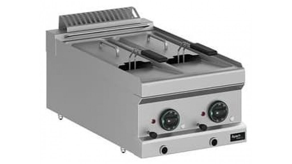 400× 700 × 250 мм; 380 В; 10,5 кВт; 20 кг; две ванны объёмом 6 л каждая; электромеханическое управление; холодная зона; температурный режим: 90…190 °С; в комплект входит корзина с крышкой; корпус из нержавеющей стали.