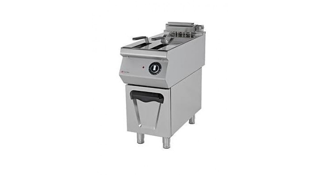 400× 930 × 915 мм; 380 В; 18 кВт; 27 кг; напольная; одна ванна объёмом 50 л; две корзины; электромеханическое управление; холодная зона; температурный режим: 135…180 °С; кран для слива; корпус из нержавеющей стали.