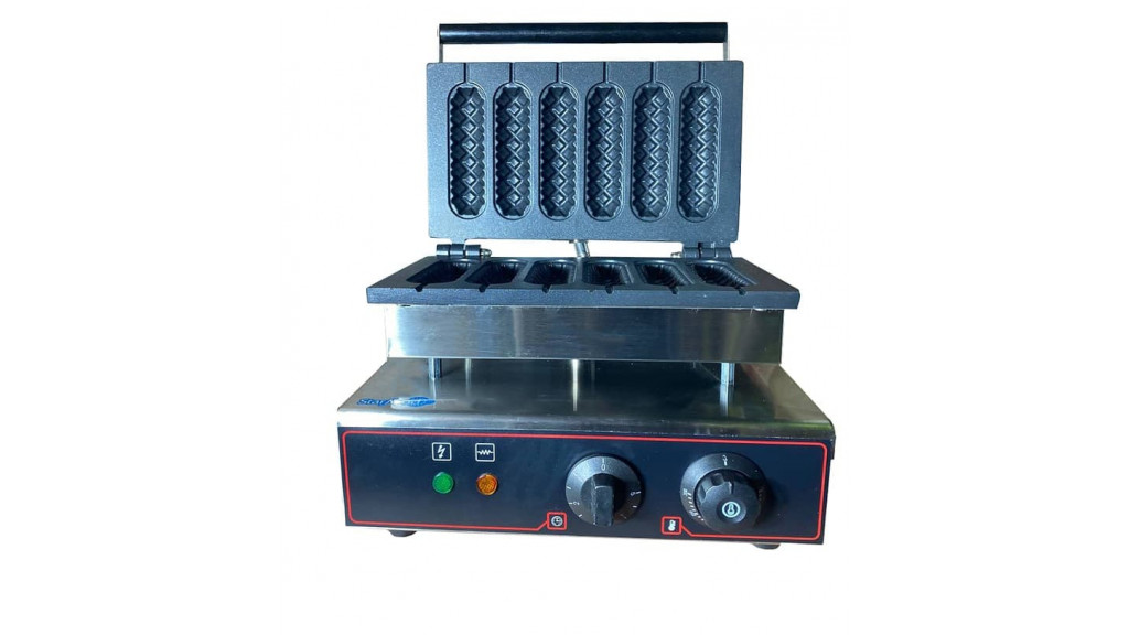 Аппарат для шести сосисок в тесте; 360 × 300 × 245 мм; корпус из нержавеющей стали; чугунные пресс-формы; 220В; 1,55 кВт; 10 кг.