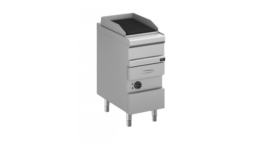 Модель с бортами оснащена съемным лотком для сбора остатков пищи, масла и жира и закрытой подставкой с регулируемыми по высоте ножками. Корпус, панель управления и вытяжная решетка выполнены из нержавеющей стали AISI 304, боковые и задняя панели - из нержавеющей стали AISI 430, лоток - из нержавеющей стали, рабочая поверхность – из чугуна.