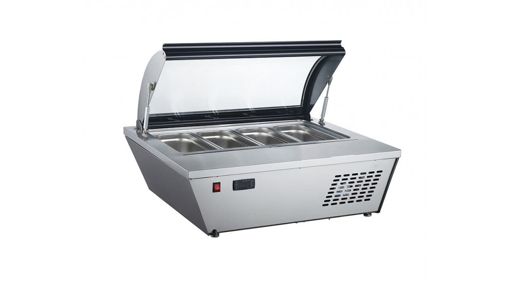 Настольная; температурный режим: -25...-18 C°; на четыре нержавеющих ёмкости объёмом 5 л каждая; объём витрины: 67 л; 220 В; 0,16 кВт; 805 × 666 × 385 мм; 30 кг.