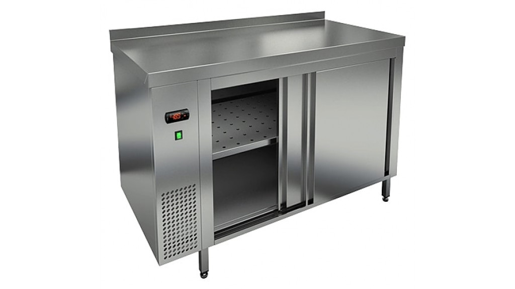 Модель оснащена дверями типа «купе». Нагрев осуществляется с помощью электрического нагревателя (ТЭНа). Конструкция стола предотвращает нагрев внешних поверхностей, так как двойные стенки корпуса и дверок сохраняют заданную температуру и защищают лицевые поверхности от нагрева.