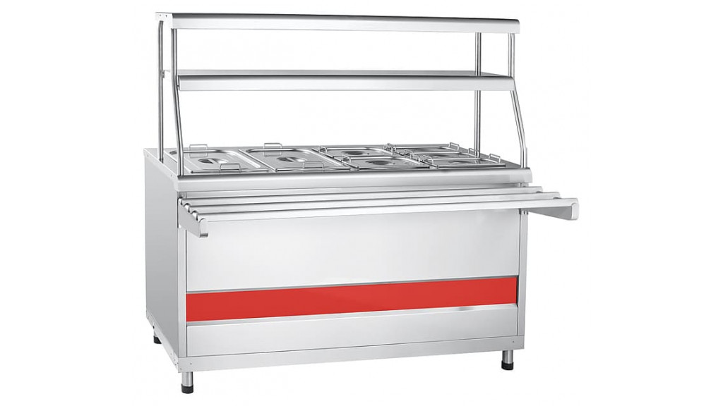Над мармитом расположена двойная полка с LED-подсветкой, предоставляющая дополнительное пространство для выкладки блюд и улучшенную их презентацию. В нижней части устройства находится нейтральный шкаф с дверцами для хранения кухонного инвентаря, способствуя оптимальной организации рабочего пространства.