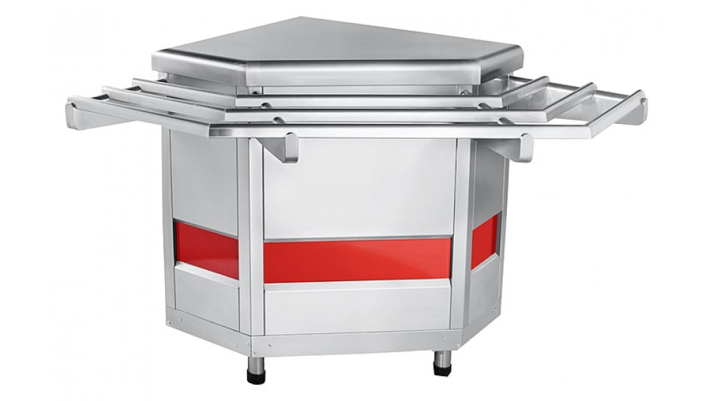 Модуль используется для соединения элементов технологической линии самообслуживания «Аста». Оборудование имеет форму сектора и полностью выполнен из нержавеющей стали. Для устойчивости модуль оснащён регулируемыми по высоте ножками.