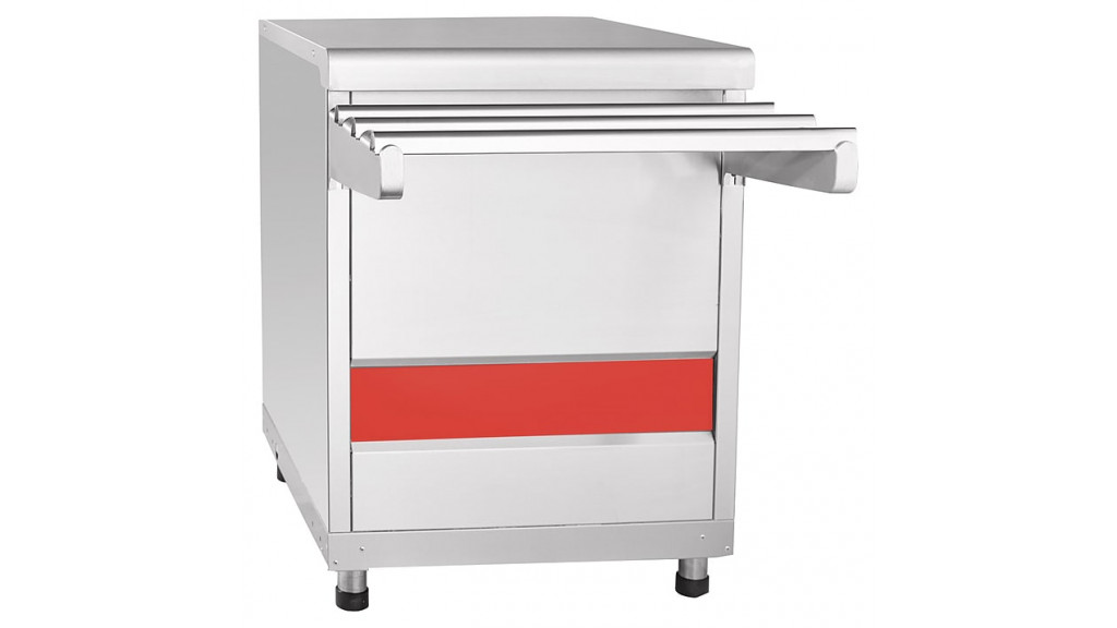 На передней обшивке расположены кронштейны с направляющими для подносов. Задняя стенка отсутствует, что обеспечивает свободный доступ к открытому нейтральному шкафу для хранения кухонного инвентаря. Сверху модуль накрыт плоской столешницей для размещения посуды с едой и напитками.