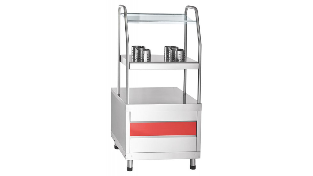 На верхней части корпуса расположена плоская столешница для подносов, к которой крепятся кронштейны для двух верхних полок. Нижняя полка имеет круглые ячейки для стаканов со столовыми приборами. Верхняя полка выполнена из прозрачного оргстекла, наклонена вперёд и предназначена для нарезанного хлеба.
