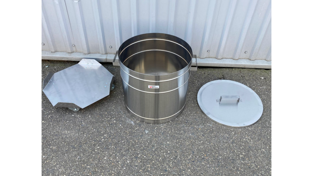 Нержавеющий бак объёмом 52 литра установлен на восьмиугольную платформу из нержавеющей стали AISI 304, опирающуюся на 4 колеса; габариты: 450 × 450 × 500 мм.