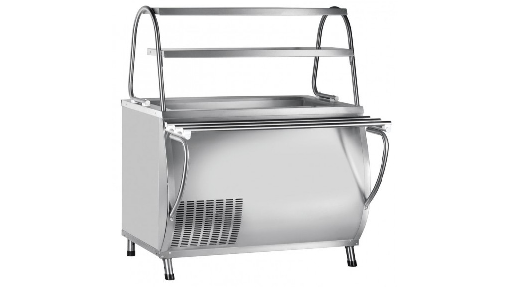 Прибор оснащён двухуровневой полкой над ним для размещения неохлаждённых порционных блюд и напитков, а также ванной из нержавеющей стали с охлаждением и нейтральным шкафом для хранения кухонных принадлежностей. Высота ножек регулируется.