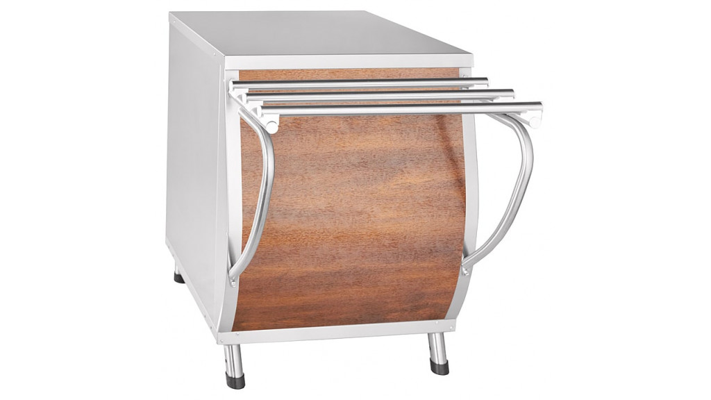 Передняя стенка модуля, как и у всех элементов линии, имеет выпуклую форму. На ней расположены кронштейны с направляющими для подносов. Задняя стенка отсутствует, что обеспечивает прямой доступ к большому открытому шкафу для хранения кухонного инвентаря.