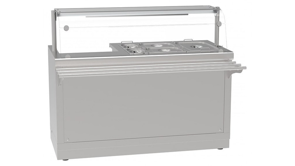 Модель оснащена электрической конфоркой для наплитной посуды, ванной для подогрева гастроёмкостей, нейтральным шкафом с распашными дверцами для хранения кухонного инвентаря и панелью управления с двумя поворотными переключателями.