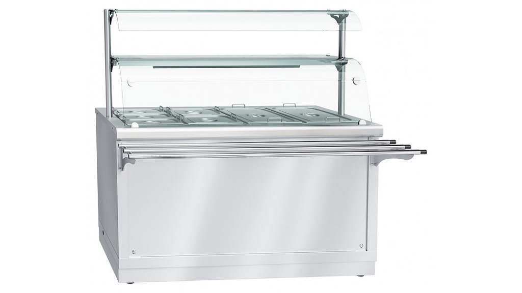 Модель оснащена тремя ТЭНами и ванной, в которой можно разместить гастроёмкости для продуктов и готовых блюд. Корпус и панели оборудования выполнены из нержавеющей стали.