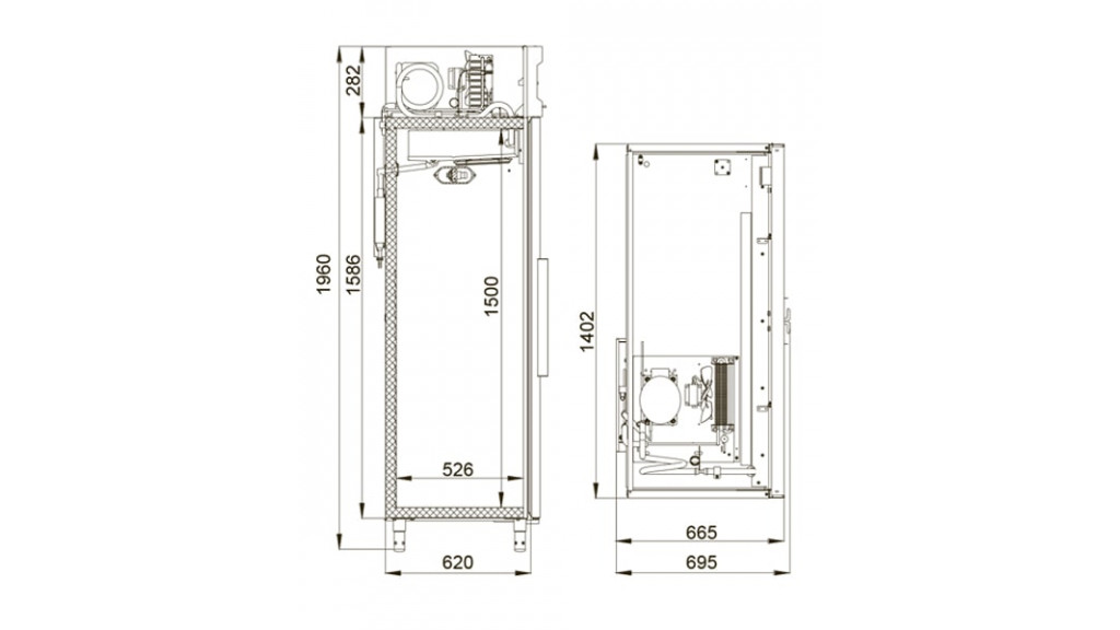 Температурный режим: –5...+5 °C; объём: 1000 л; корпус из нержавеющей стали (снаружи и внутри, кроме задней стенки); 230 В; 6 кВт·ч/сут; 1402 × 695 × 1960 мм; 159 кг.