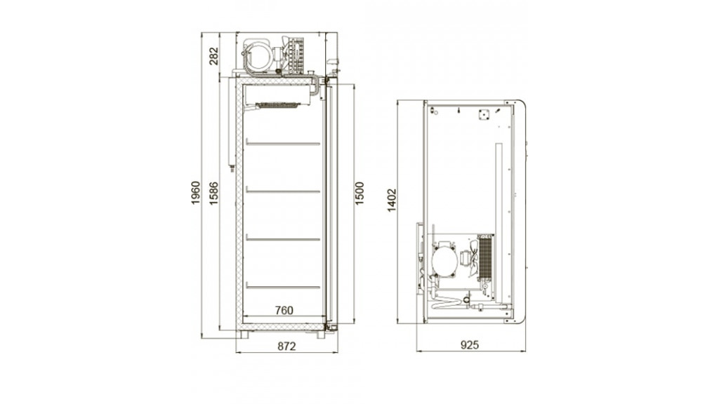 Температурный режим: –5...+5 °C; объём: 1400 л; корпус из окрашенной оцинкованной стали; 230 В; 6,5 кВт·ч/сут; 1402 × 925 × 1960 мм; 185 кг.