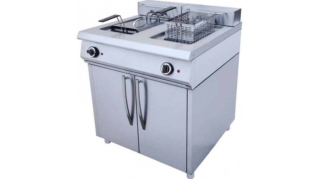 Напольная; электрическая; закрытый стенд с дверцами; 2 нерж. ванны объёмом по 15 л каждая (6 л фритюра на ванну); 2 корзины (395 × 245 × 110 мм); крышки; краны для слива; без функции автоподъёма корзин; темп. режим: 50–190 °C; механическое управление; защита от перегрева; без таймера; 380 В; 7,6 кВт; 800 × 860 × 980 мм; 67 кг.