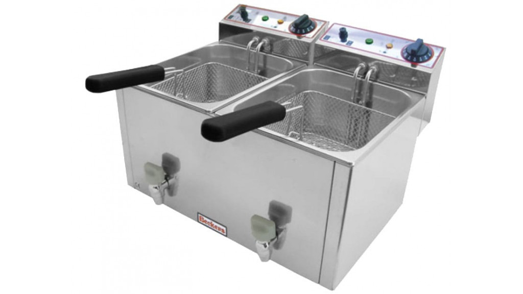 Настольная; электрическая; 2 нерж. ванны объёмом по 8 л каждая; 2 корзины (215 × 240 × 105 мм); холодная зона; краны для слива; темп. режим: 50–190 °C; механическое управление; защита от перегрева; без таймера; 220 В; 6 кВт; 400 × 525 × 345 мм; 13 кг.