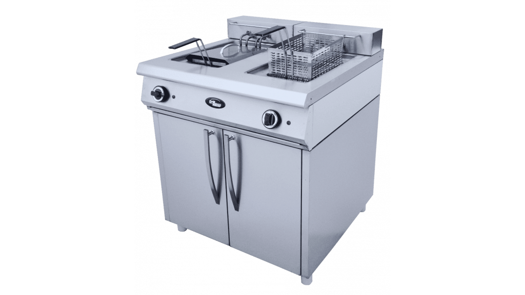 Напольная; электрическая; закрытый стенд с дверцами; 2 нерж. ванны объёмом по 13 л каждая (9 л фритюра в ванне); крышки; краны для слива; без функции автоподъёма корзин; темп. режим: 50–195 °C; механическое управление; защита от перегрева; без таймера; 380 В; 7,6 кВт; 800 × 860 × 980 мм; 67 кг.