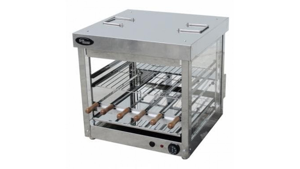 550 × 555 × 520 мм; 6 шампуров; настольное исполнение; стеклянная задняя и боковые стенки; автоматическое вращение всех шампуров; подъемная крыша; регулирующая уровень тепловой обработки продукта; сетка для барбекю в комплекте; 220 В.