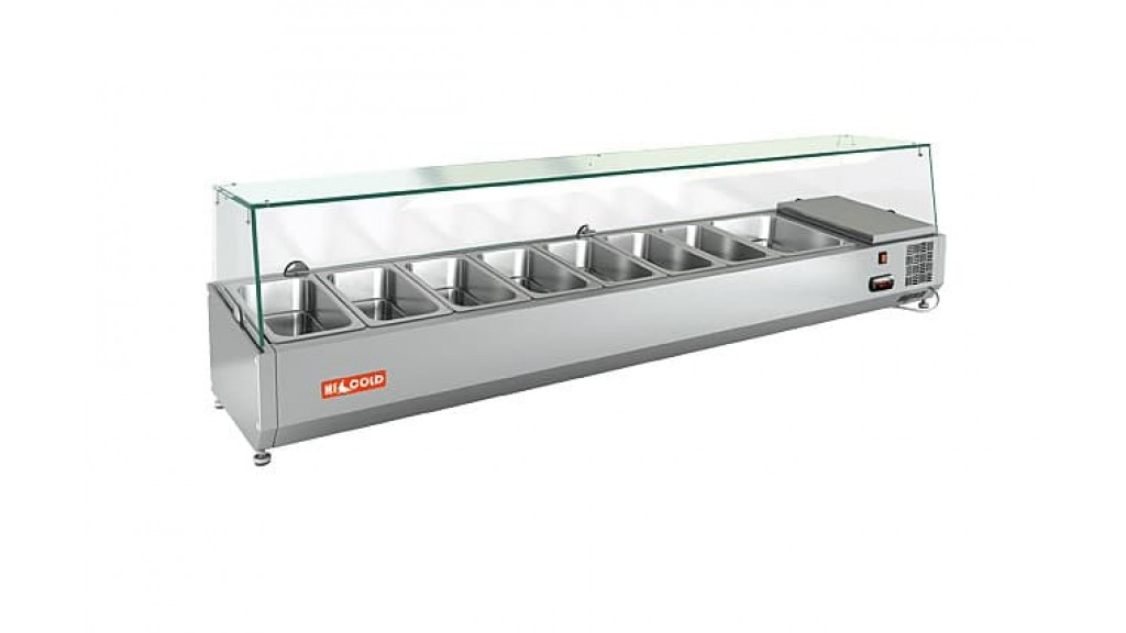 Витрина Hicold VRTG 1835 для стола Hicold PZ3 используется в сфере общественного питания и торговли для демонстрации, охлаждения и кратковременного хранения салатов, гарниров, закусок и других готовых блюд.