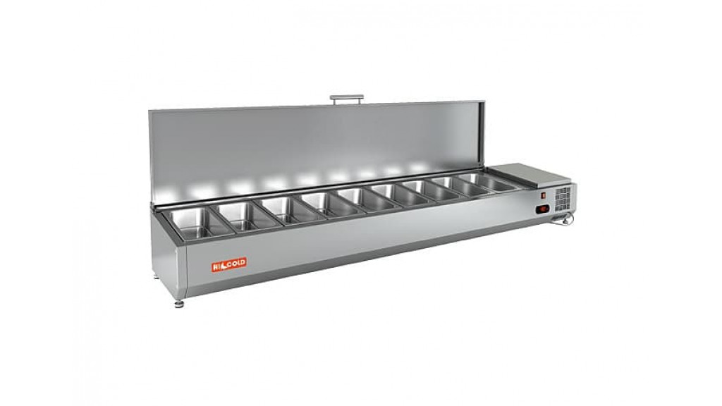 Витрина Hicold VRTU 1970 используется в кафе, ресторанах и других предприятиях общественного питания для демонстрации, охлаждения и хранения готовых блюд, таких как салаты, гарниры и закуски.
