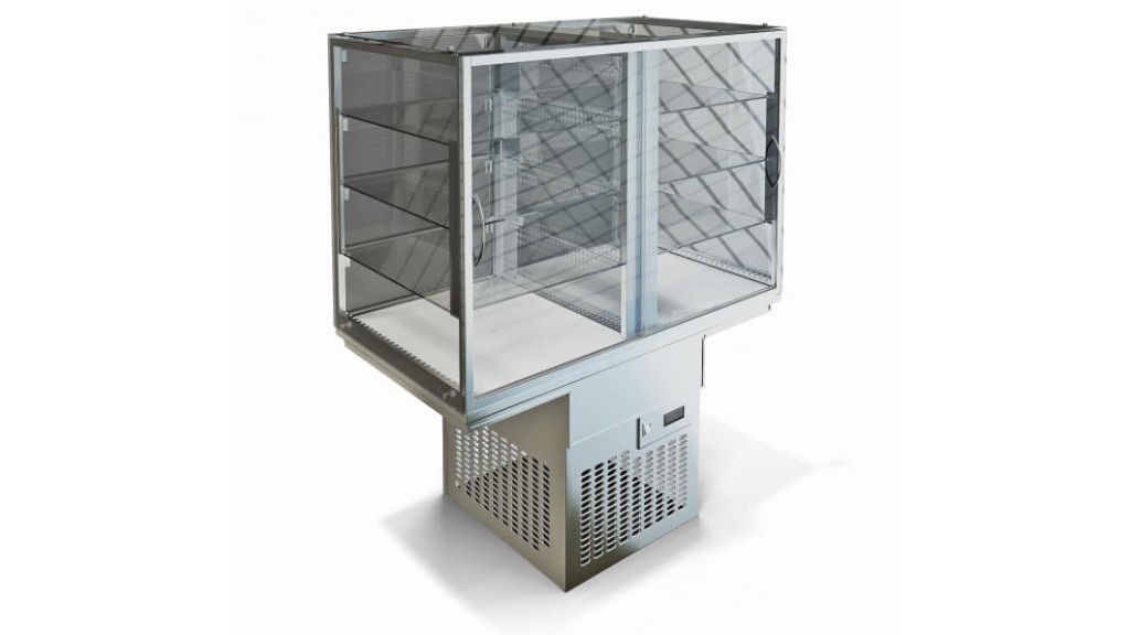 1025 × 590 × 1240 мм; Витрина охлаждаемая, корпус закалённое стекло толщиной 8 мм; три уровня из закалённого стекла толщиной 5 мм; хладоагрегат мощность 485 Вт; компрессор Danfoss. Двери-купе со стороны оператора, лючками со стороны покупателя, подсветкой. Пос