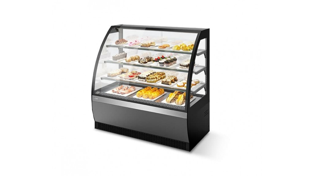 1305 × 740 × 1265 мм, витрина кондитерская, t режим °C 0 … +7; стеклопакеты, 3 стеклянные полки, подсветка LED, размер выкладки: 1305 × 443, вентилируемое охлаждение, раздвижные задние шторки, потребление электроэнергии 10,4 кВтч/сутки, 180 кг