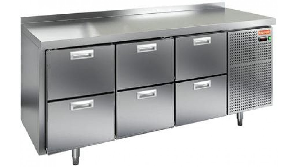 Температурный режим: -2...+10 C°; шесть выдвижных ящиков; боковое расположение агрегата; возможность использования гастроемкости вместо полок; динамическое охлаждение; 220 В; 0,46 кВт; 1835 × 700 × 850 мм; 505 л; 115 кг.