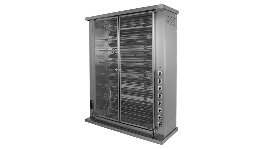 1298 × 507 × 1560 мм; 380 В; 19,2 кВт; 160 кг; на 40 тушек; 8 шампуров в один ряд; стеклянная дверь; корпус из нержавеющей стали; внутренняя подсветка.